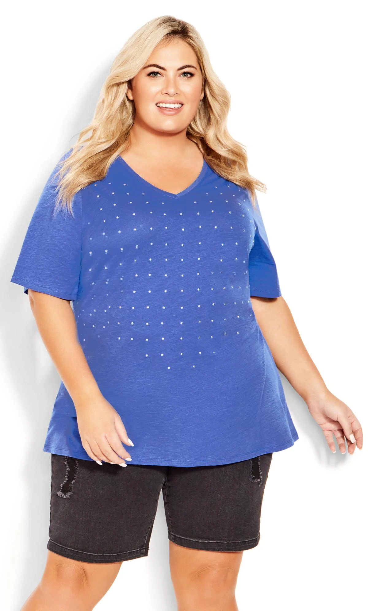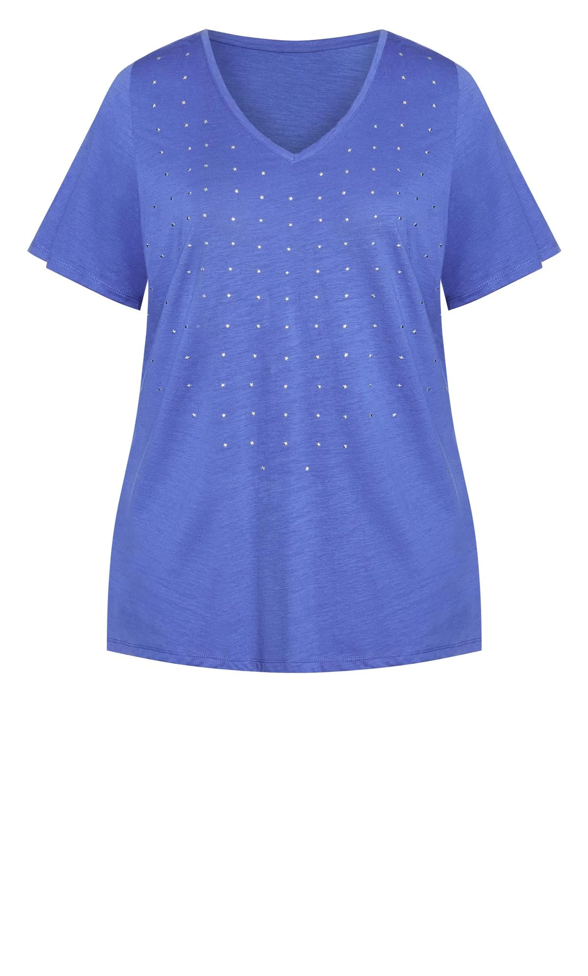 Elevate your casual attire with the Avenue Blue Studded V-Neck T-Shirt, a perfect blend of comfort and subtle detailing. This t-shirt showcases a stylish studded V-neckline that adds a touch of edginess to your everyday look. Pair it with distressed jeans or a faux leather skirt for an effortlessly casual outfit.