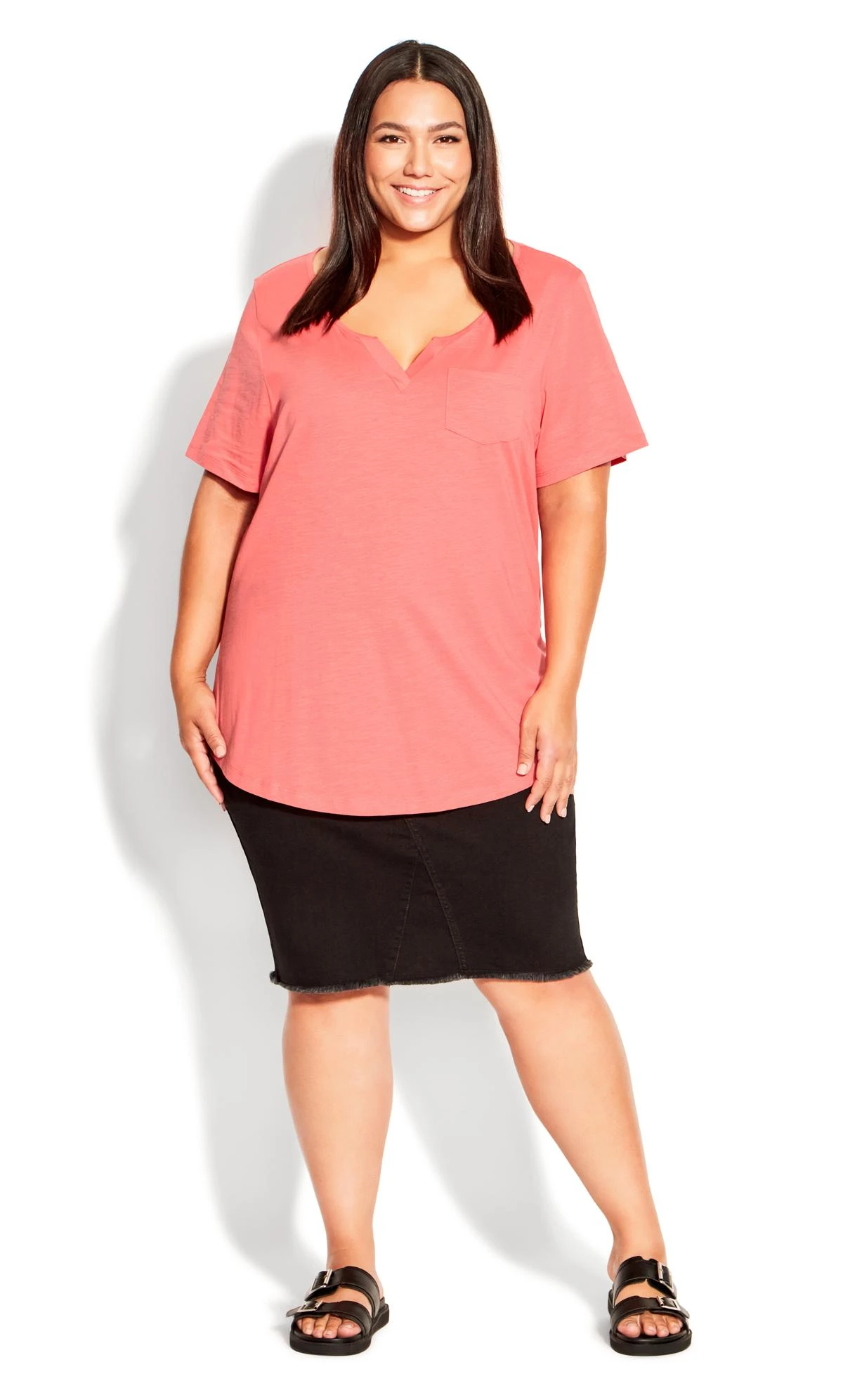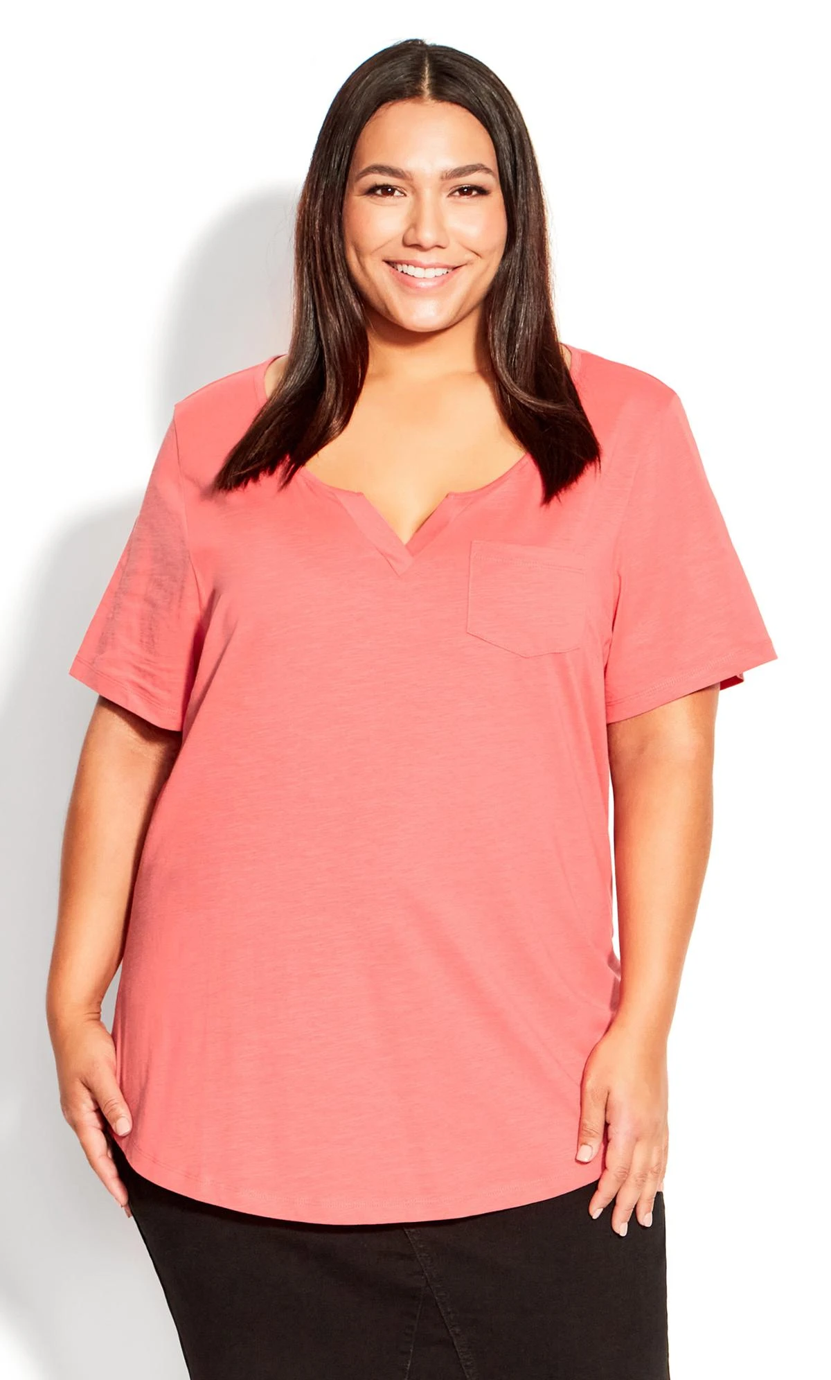 Enhance your everyday style with the Avenue Coral Orange V-Neck Pocket T-Shirt. The orange hue and functional pocket detail create a versatile and chic addition to your wardrobe. Balancing comfort and style, it’s ideal for both casual and more put-together looks. Whether paired with jeans or skirts, the purple V-neck pocket t-shirt adds a touch of sophistication and ease to your ensemble, reflecting your dynamic and fashion-forward sense.