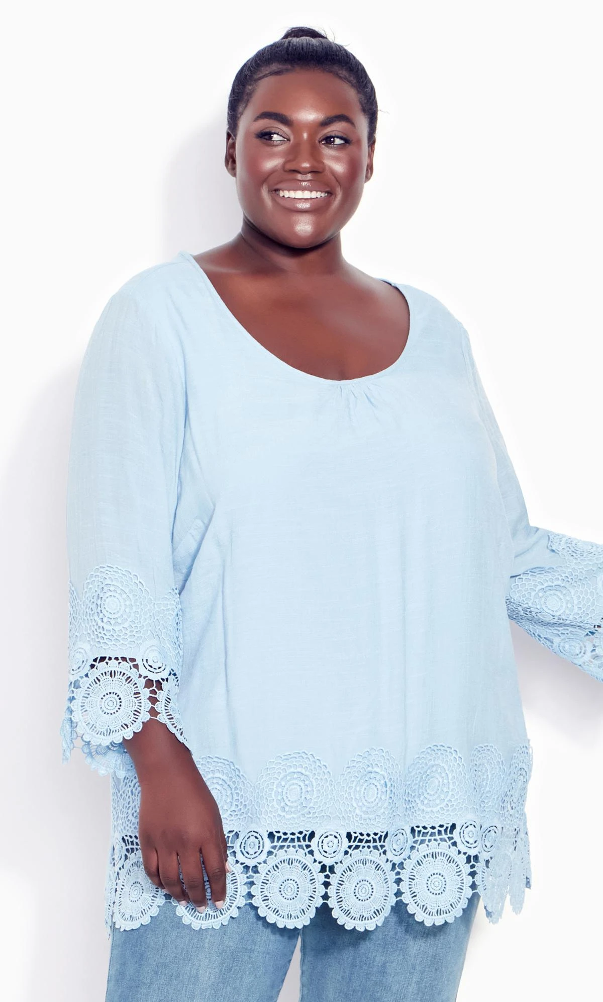 Elevate your wardrobe with the Avenue Turquoise Blue Lace Hem Top. The delicate lace hem detail adds a touch of elegance to this vibrant blue top. Embrace versatile style effortlessly, whether it’s a casual day out or a special occasion that calls for a pop of color and charm.