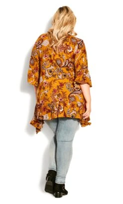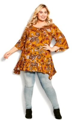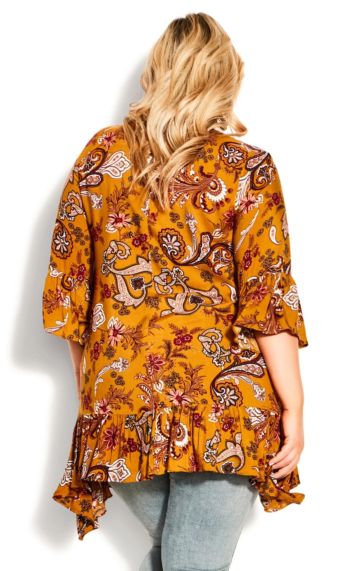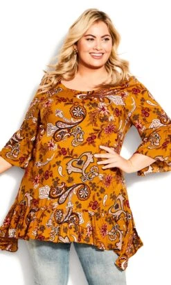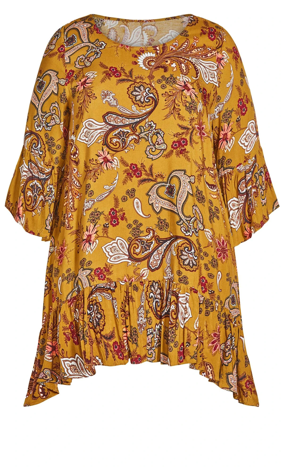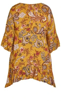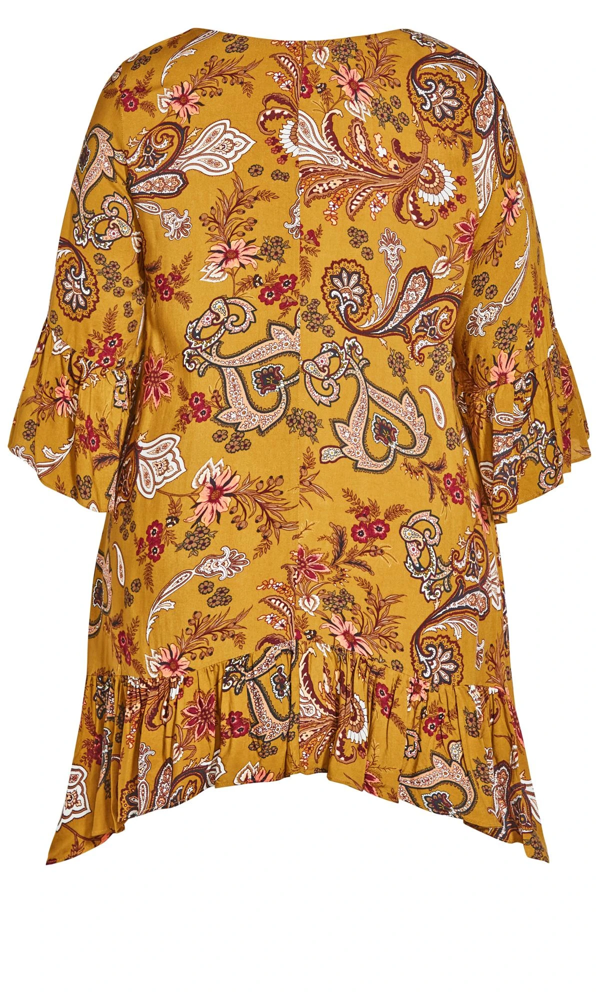 Infuse your style with warmth using the Avenue Mustard Yellow Paisley Print Frill Hem Top. The inviting mustard hue and intricate paisley design meet a playful frill hem for a chic look. Versatile and captivating, this top adds a touch of vibrant elegance to your outfit, making it perfect for any event