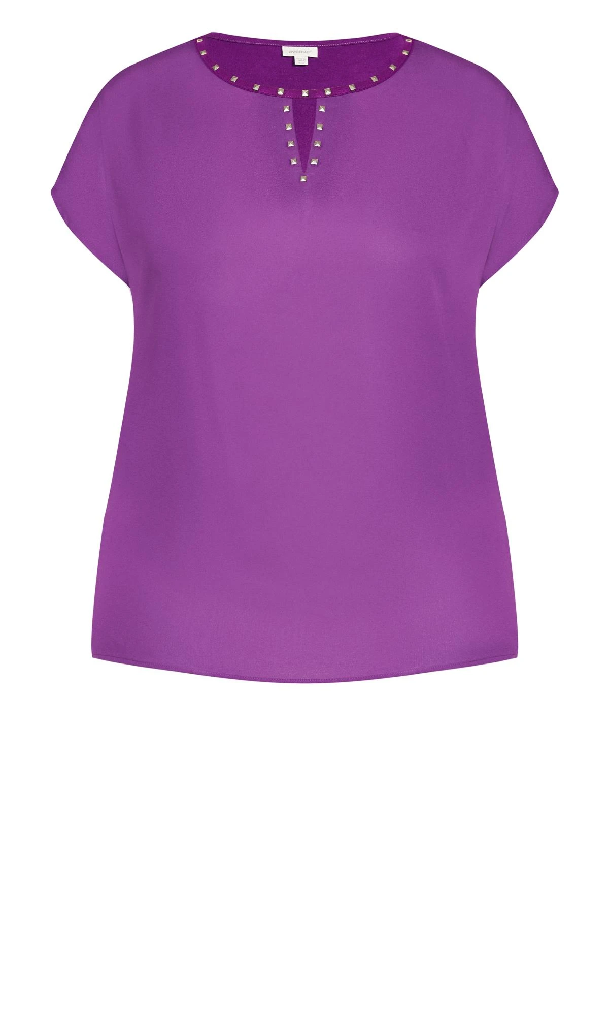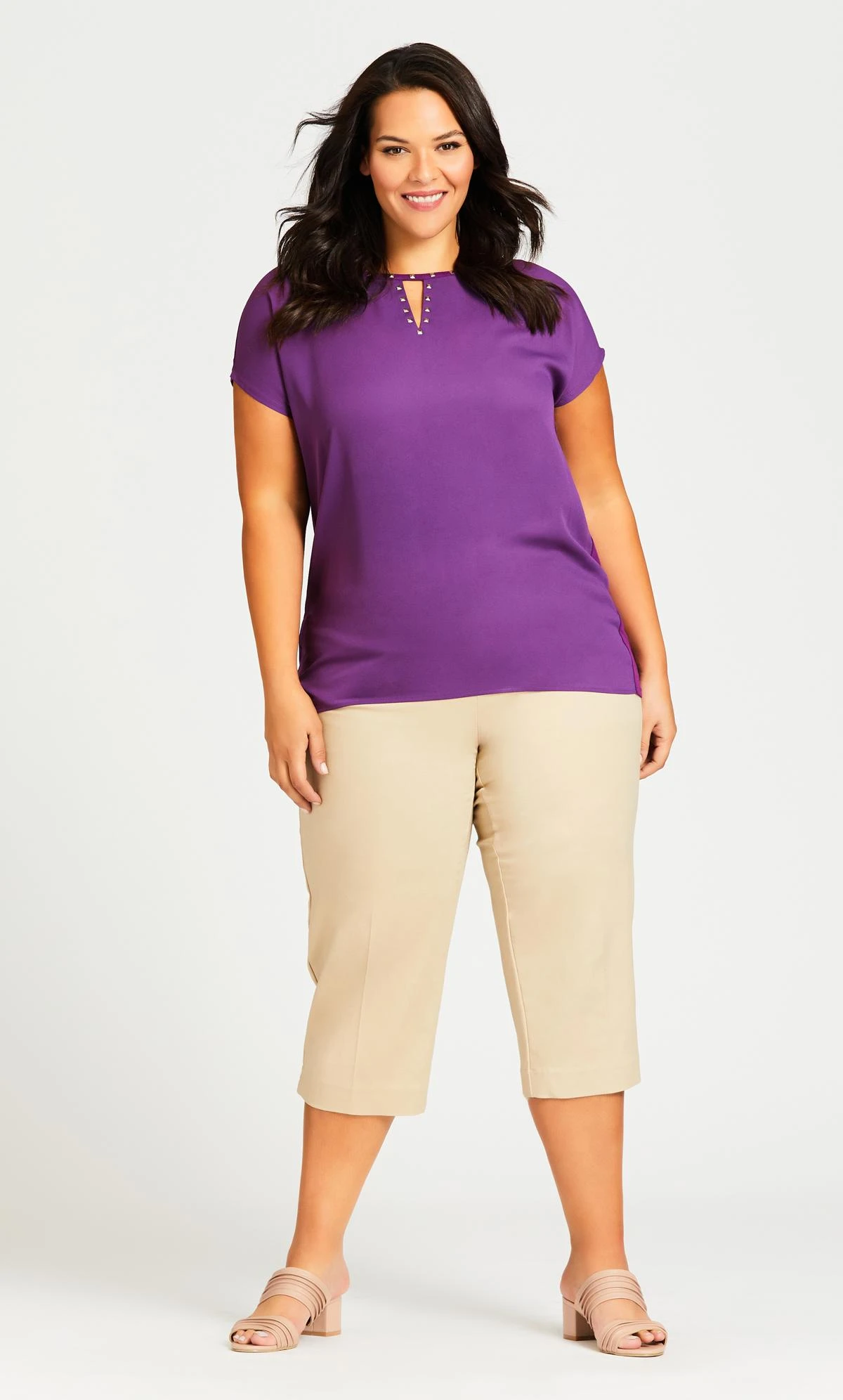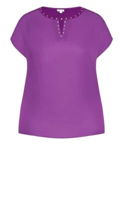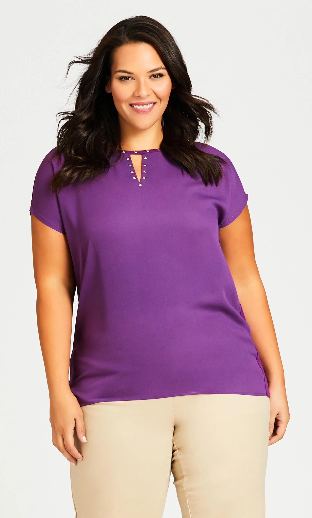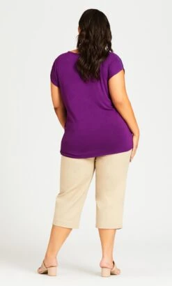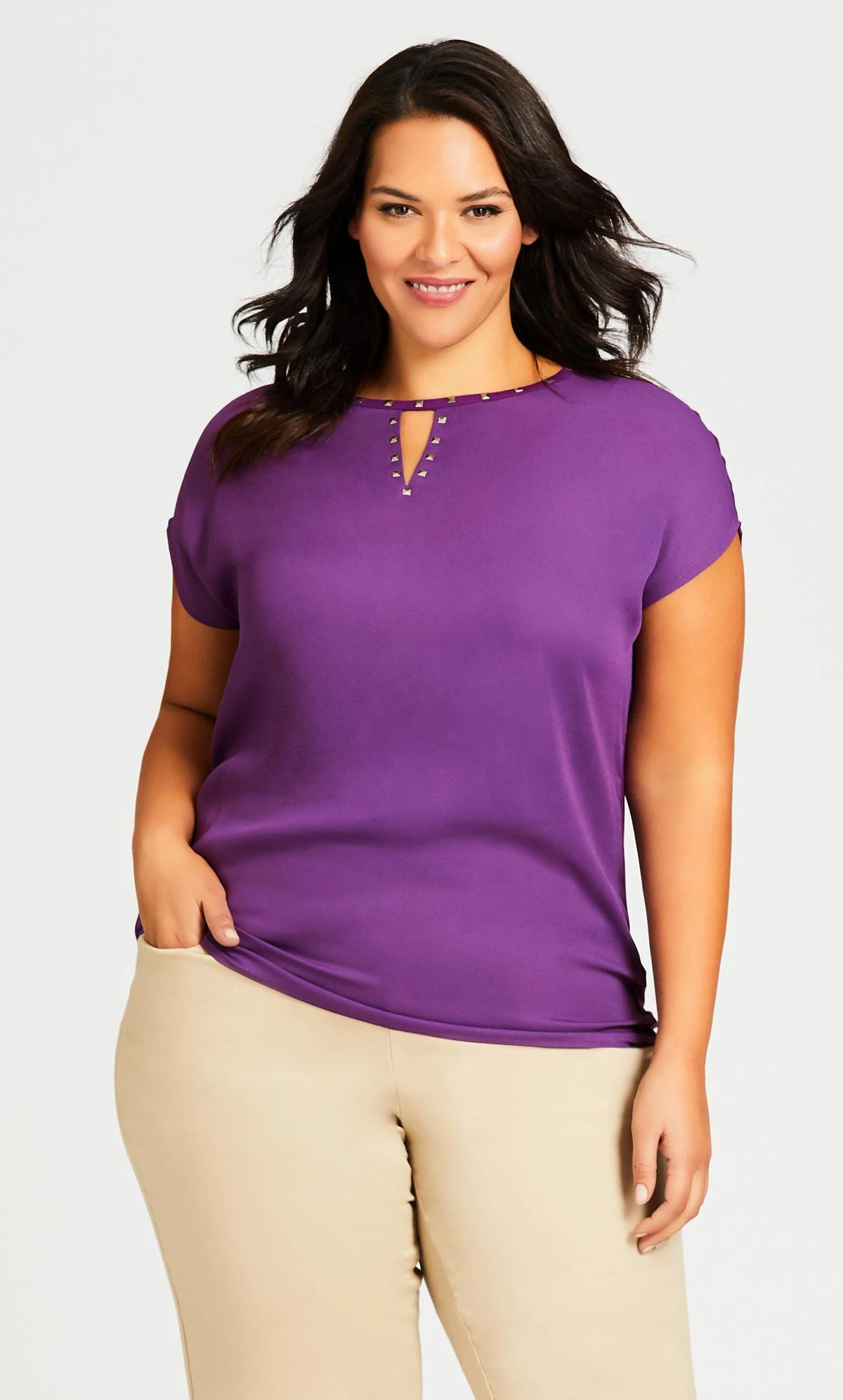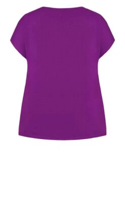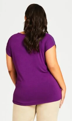 Step out in distinct style with the Avenue Purple Cut Out Detail T-Shirt. Infused with a rich purple hue, this tee stands out with its unique cut-out details, adding a modern edge to a classic design. Whether paired with jeans for a casual outing or dressed up with tailored pieces, this t-shirt promises both comfort and a touch of unexpected flair.