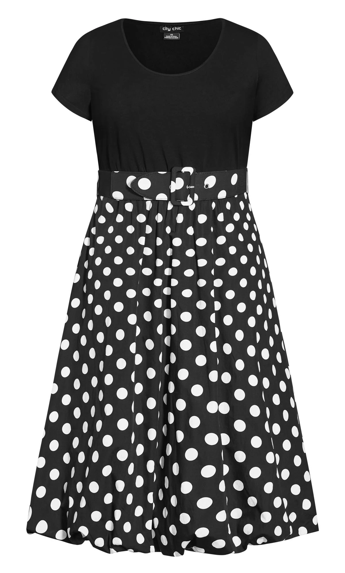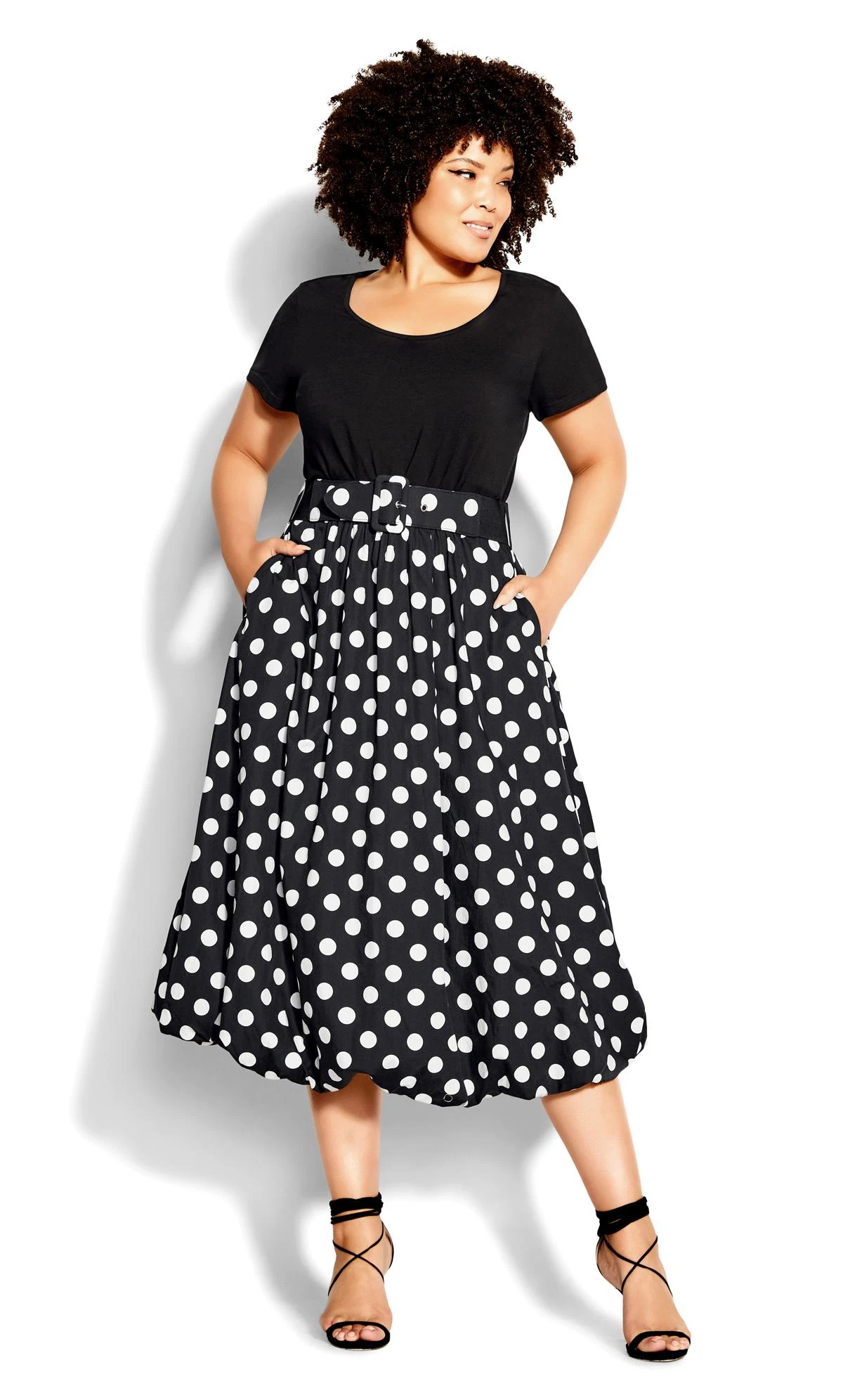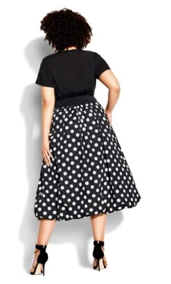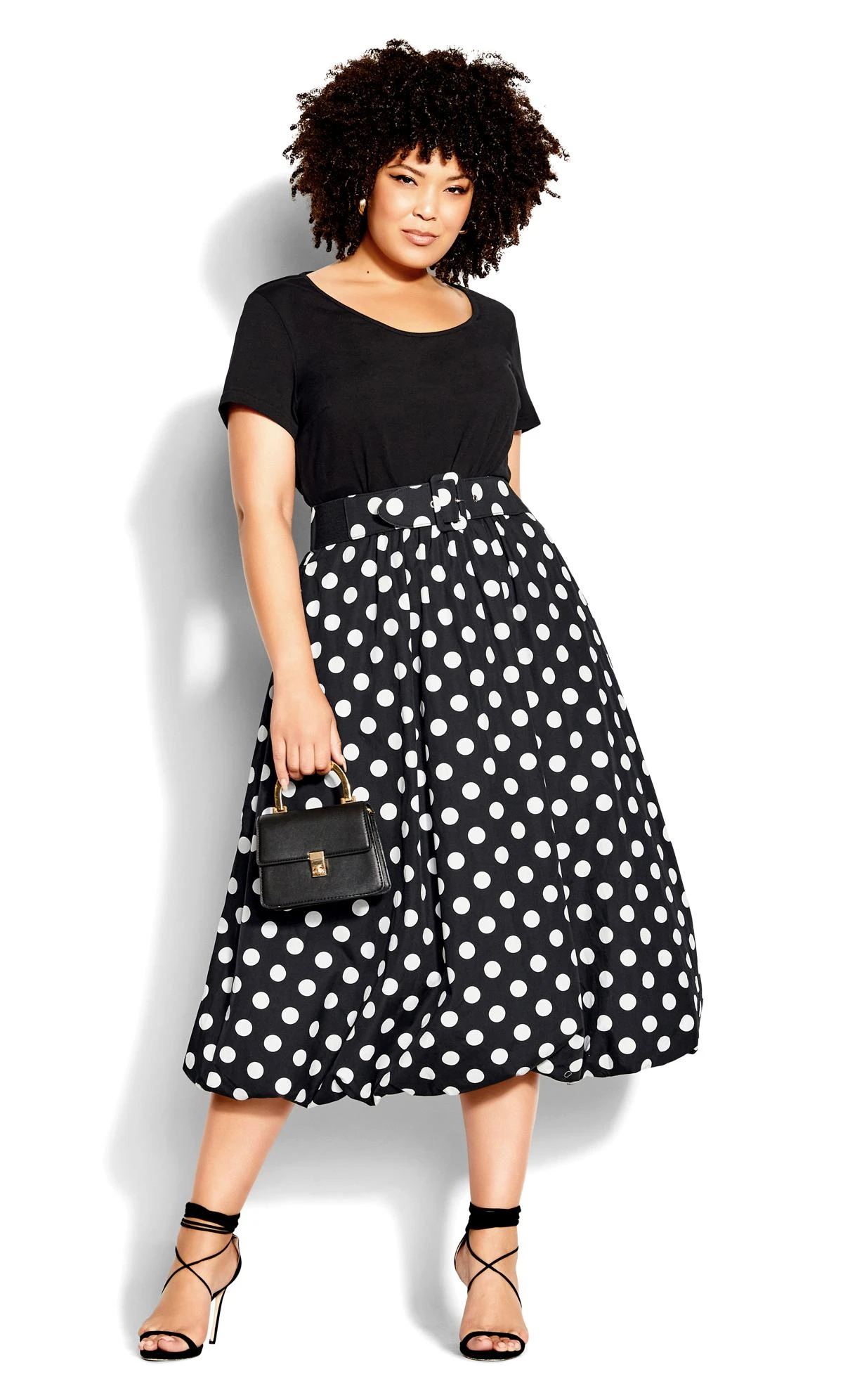 Make a statement with the City Chic Black Polka Dot Midi Puff Skirt. This skirt effortlessly combines retro charm with modern style, featuring a playful polka dot pattern and a flattering midi length with a puff silhouette. Pair it with a tucked-in blouse or a fitted top for a chic and whimsical ensemble that’s perfect for various occasions, letting the polka dots add a touch of fun and flair to your look.