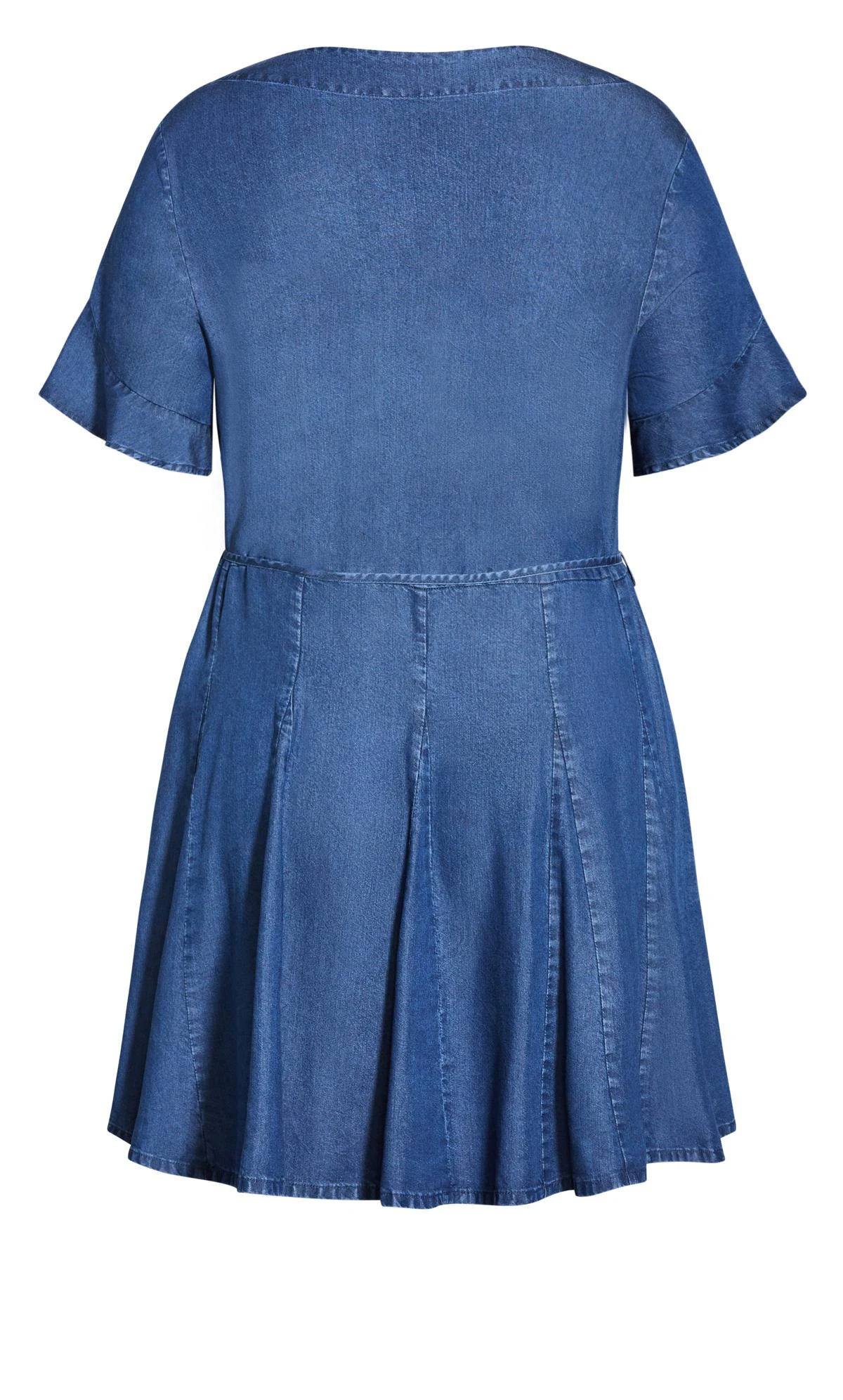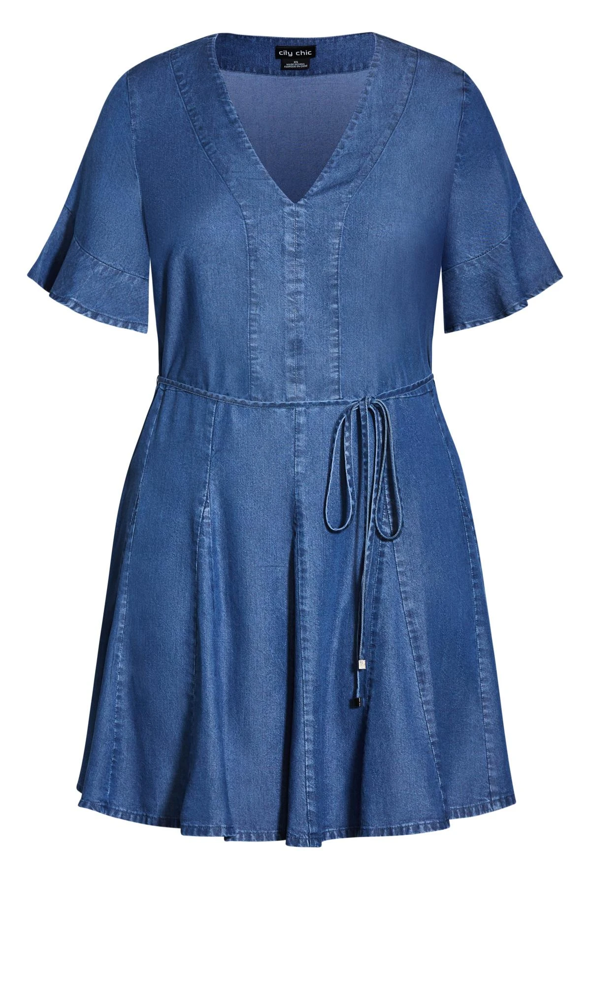Elevate your denim game with the City Chic Blue Denim Frill Sleeve Skater Dress. The soft denim fabric offers both comfort and style, while the playful frill sleeves add a feminine touch to the classic skater design. Effortlessly versatile, this dress is a must-have for those who seek chic and casual elegance.