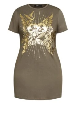 Introducing the City Chic Brown Gold Graphic Print Oversized T-Shirt Dress: a fusion of comfort and style. The rich brown hue complements the captivating gold graphic print, creating a trendy look. Whether worn solo or paired with accessories, this dress effortlessly radiates casual elegance, making a bold fashion statement in every stride.