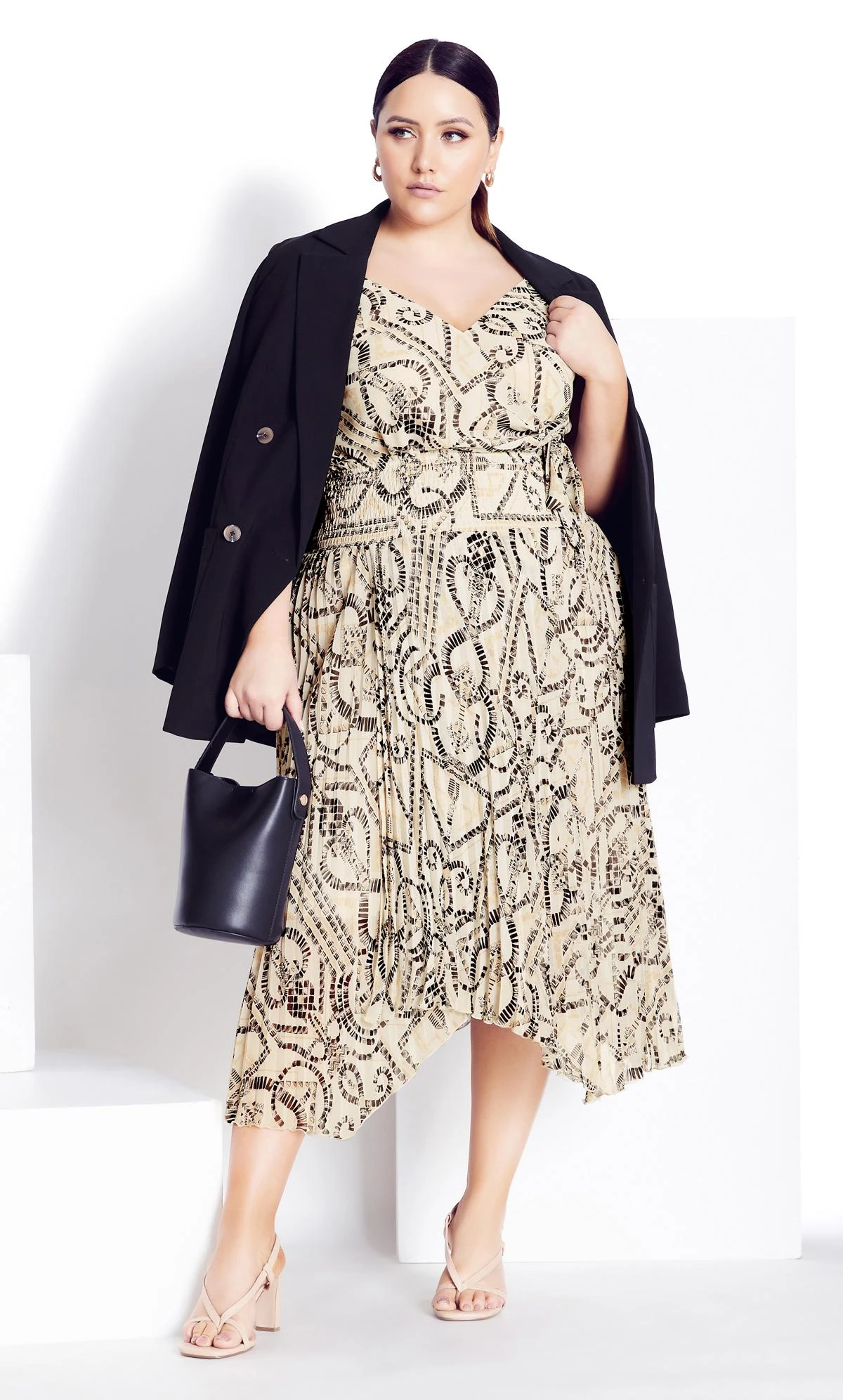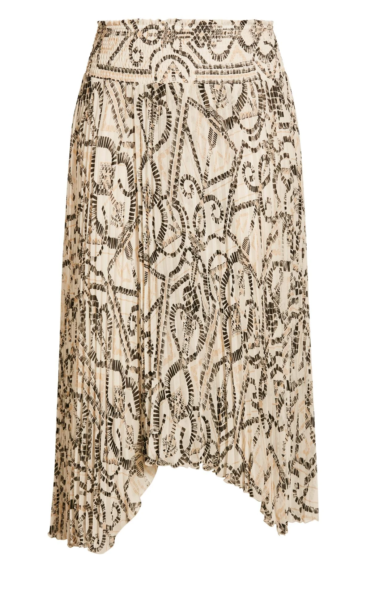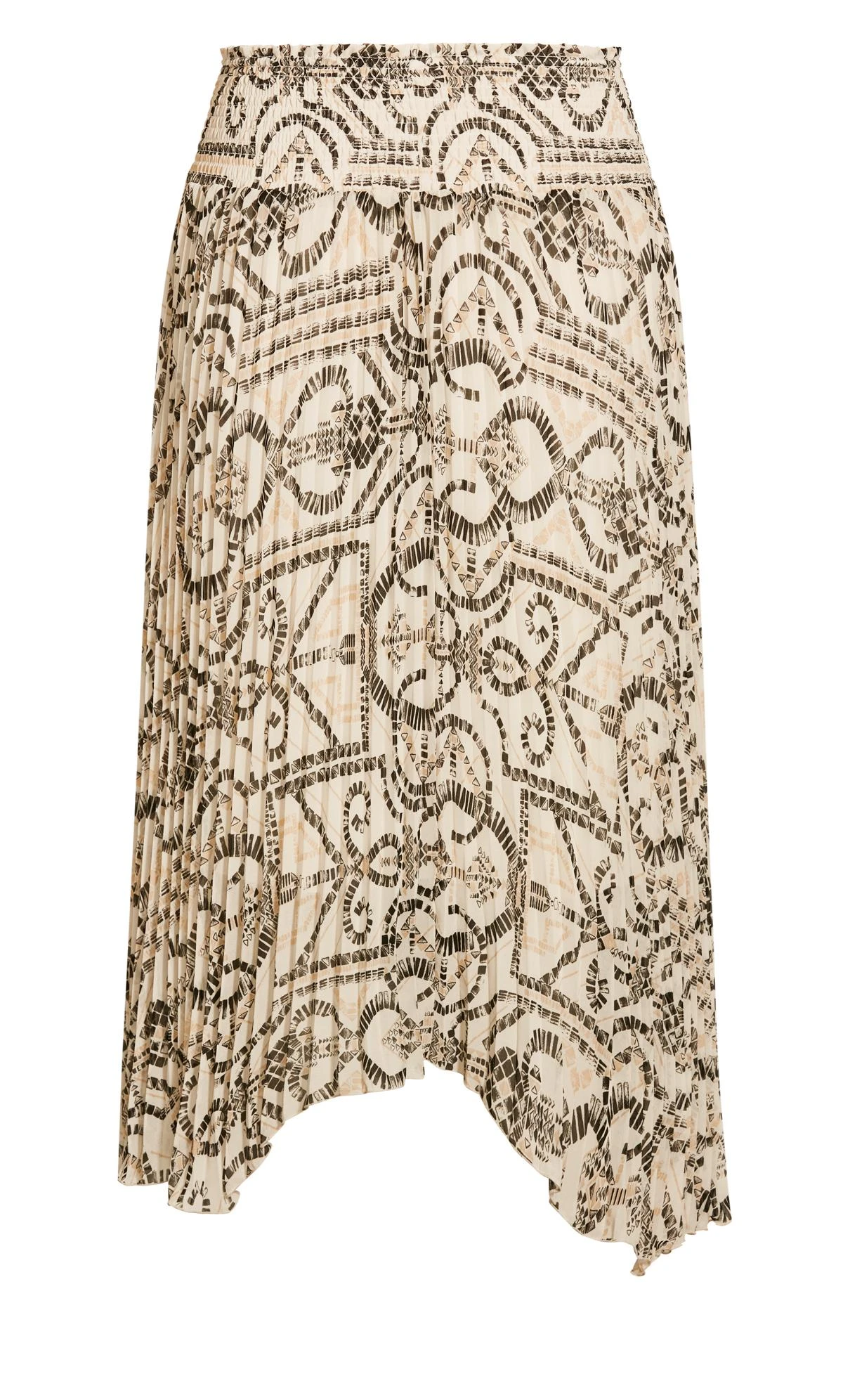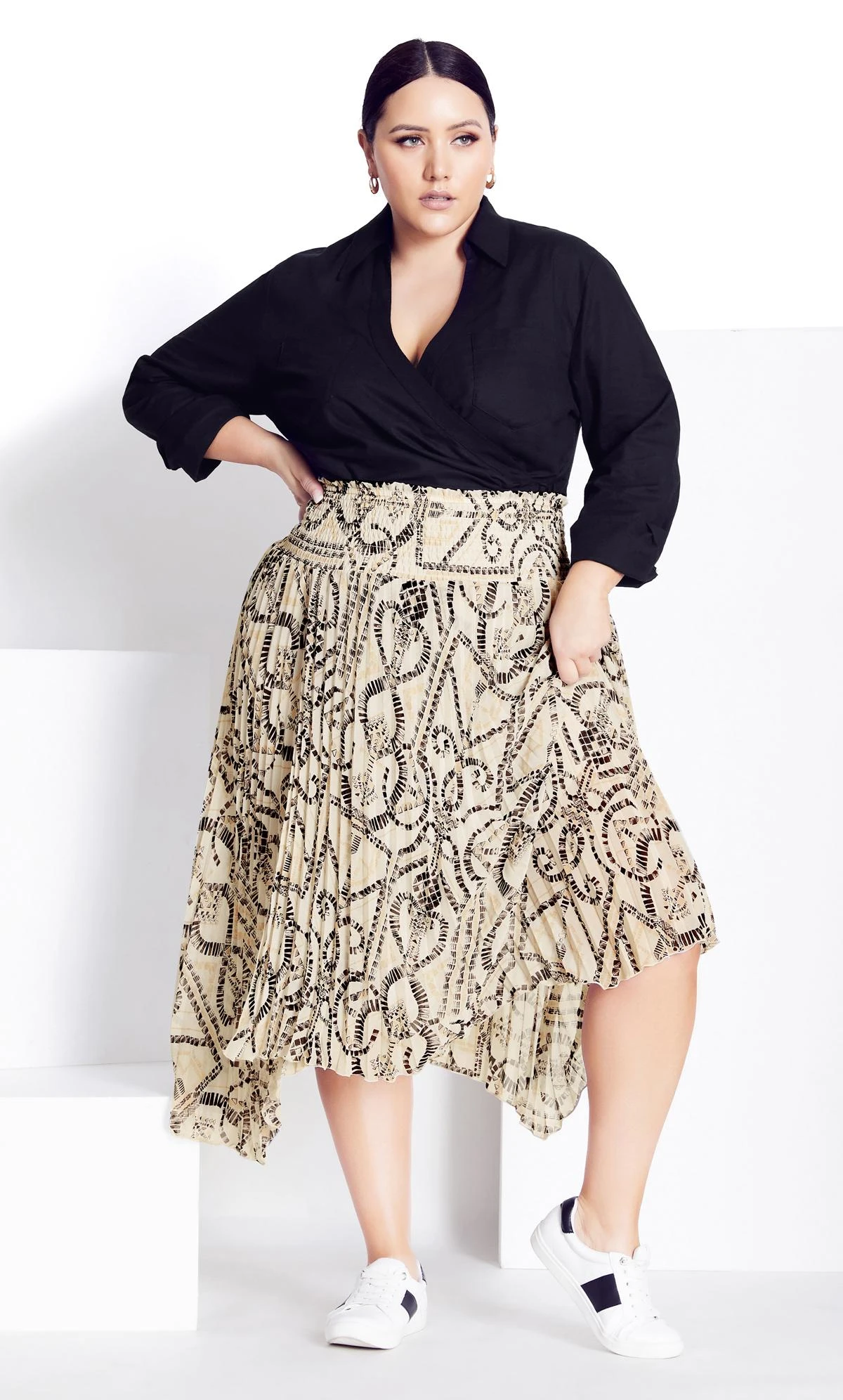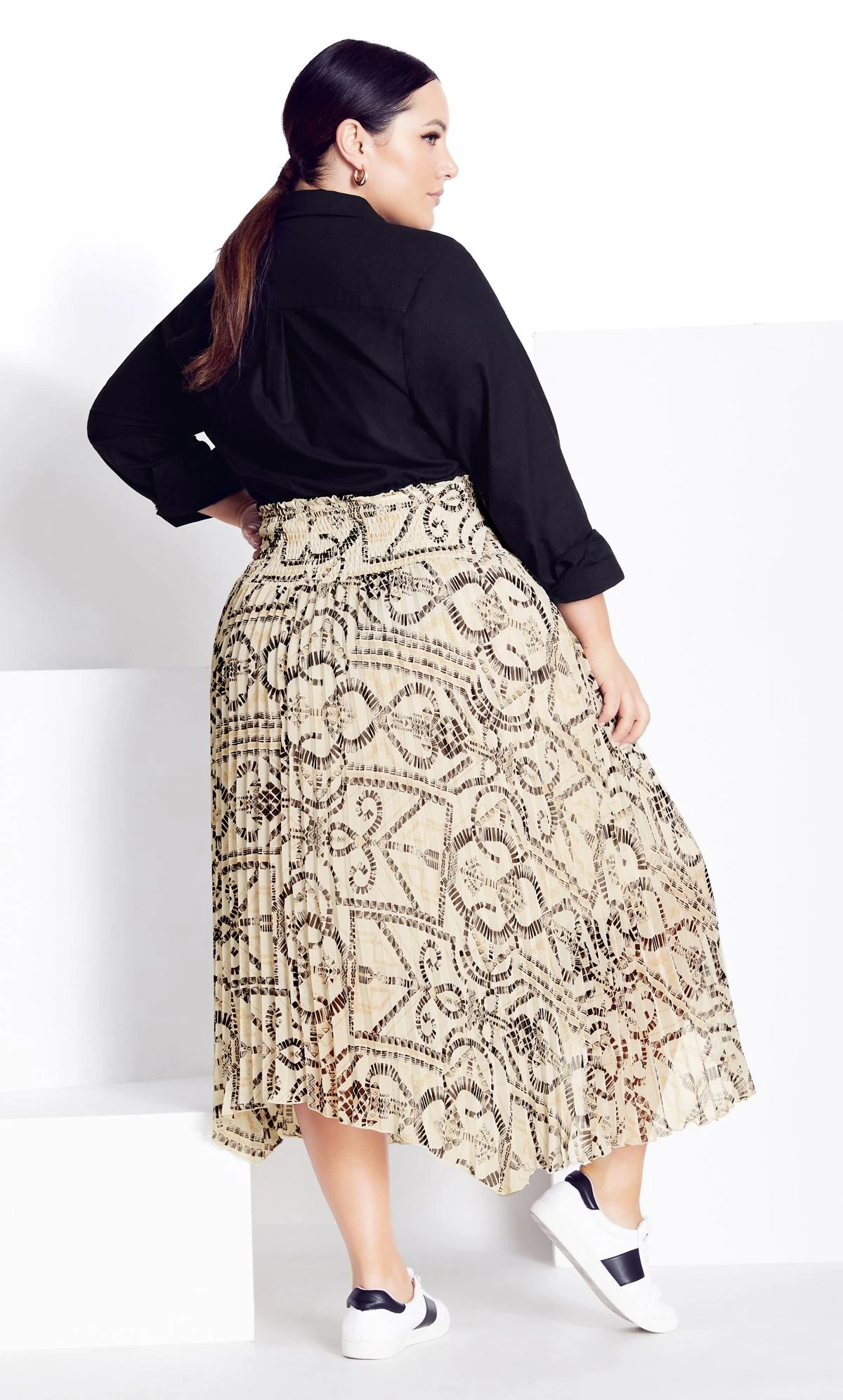 Introducing the City Chic Cream Exotic Tile Print Skirt, a fusion of sophistication and wanderlust-inspired design. This skirt showcases an exotic tile print that adds a touch of global charm to your outfit. Pair it with a tucked-in blouse and sandals for a chic daytime look, or dress it up with heels and a fitted top for an evening ensemble that captures the essence of your inner adventurer.