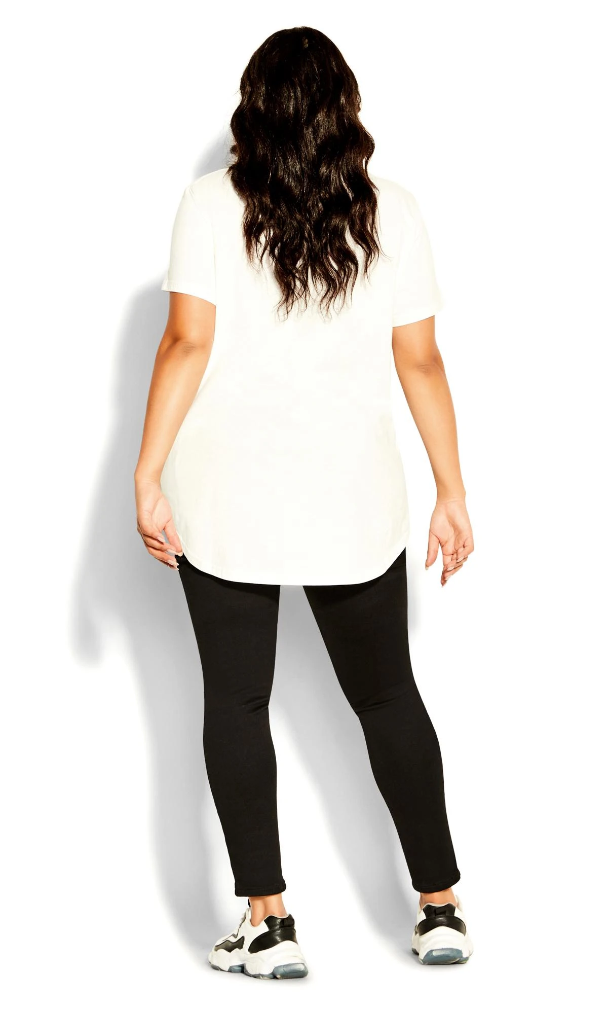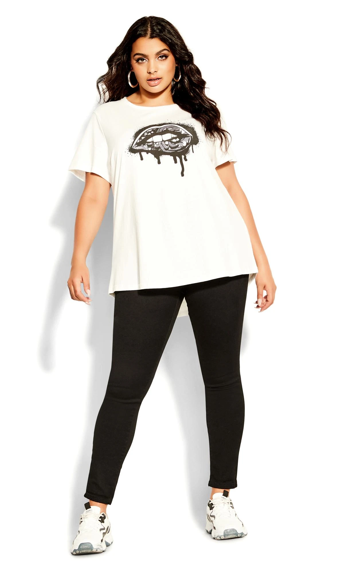Infuse a hint of glamour and attitude into your wardrobe with the City Chic Black Foil Lips Graphic Print T-Shirt. This tee effortlessly combines edgy style with a touch of sophistication, featuring a striking foil lips graphic that catches the light in all the right ways. Whether you’re embracing a casual-cool vibe or looking to make a statement, this t-shirt is your go-to choice for adding a bold yet chic element to your outfit.