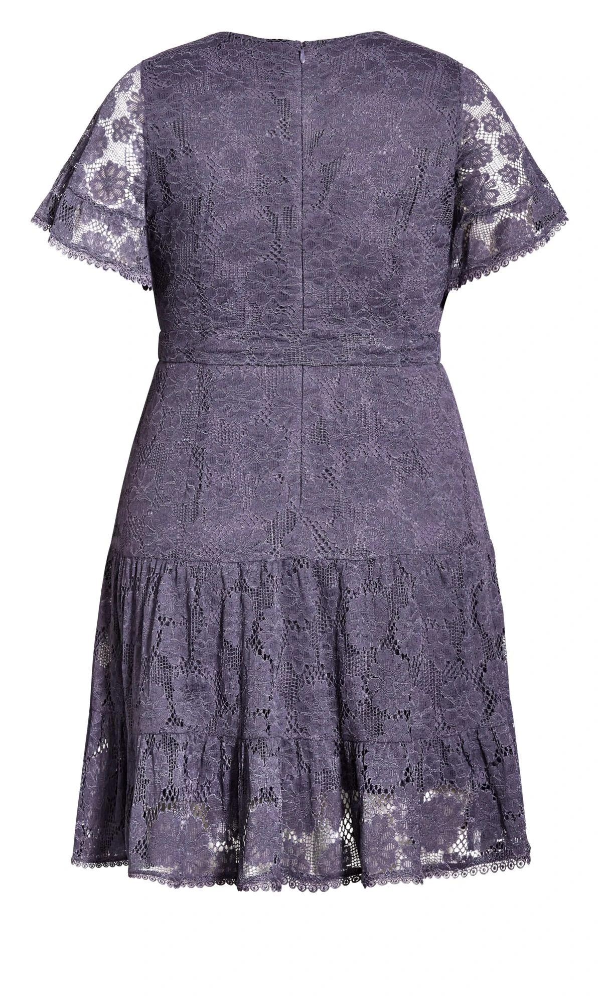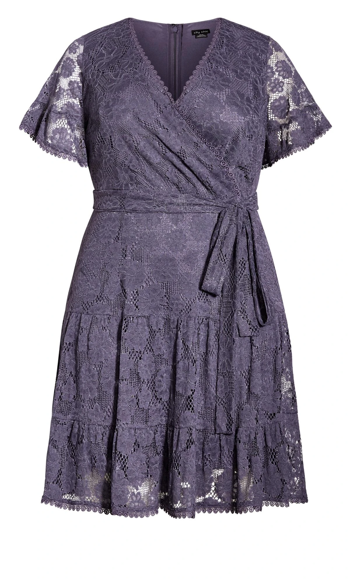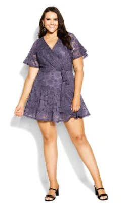 Embrace enchanting allure with the City Chic Purple Lace Wrap Front Mini Dress. The rich purple hue is adorned with delicate lace, while the wrap front design adds a touch of sophistication. Perfect for nights out or special occasions, this mini dress effortlessly combines elegance and charm for a captivating look.