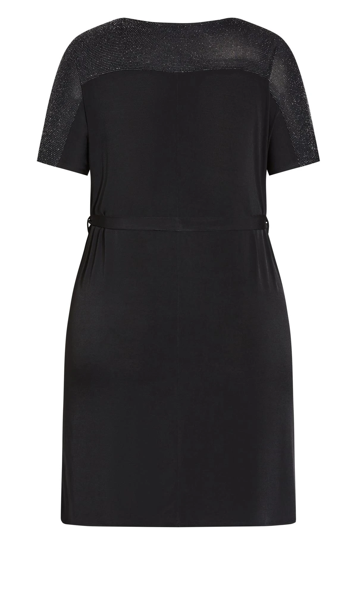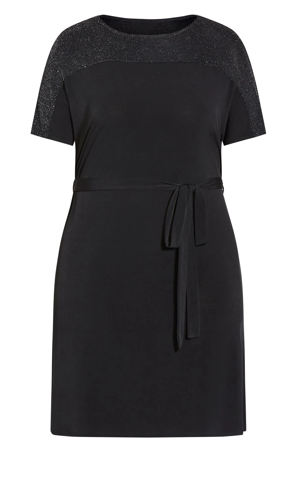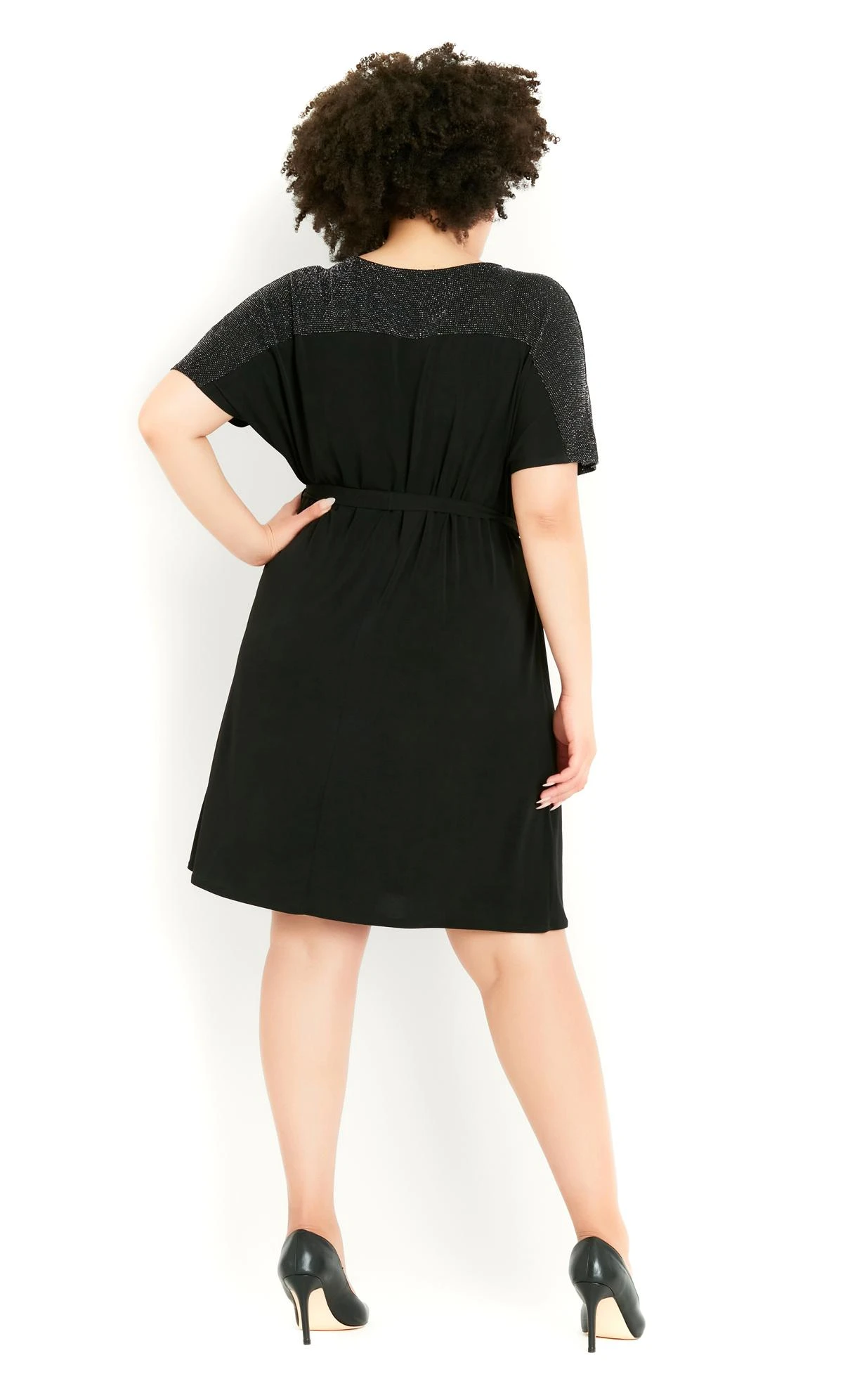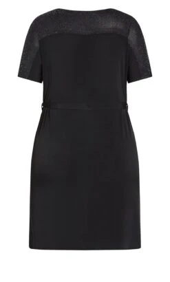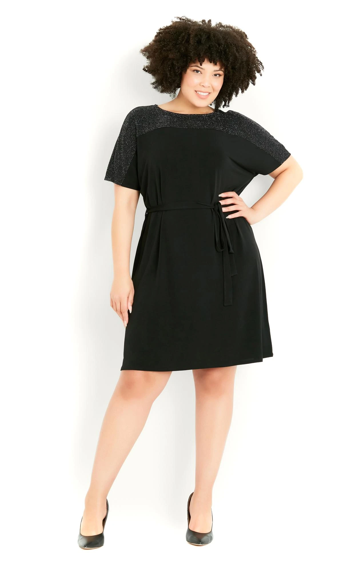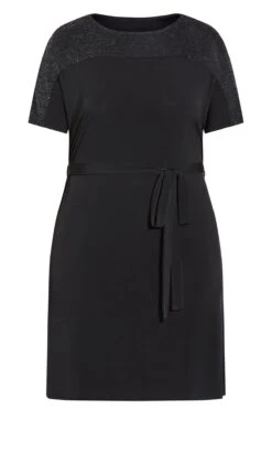 Shine bright in this Evans Navy Blue Sparkle Mini Shift Dress. This dress features a round neckline, long sleeves, and a glittery fabrication that adds some sparkle to your look. The shift silhouette is simple and elegant, perfect for any occasion. The navy blue colour is classic and flattering, easy to pair with your favourite accessories. You can wear this dress with heels, flats, or boots for a stunning outfit.